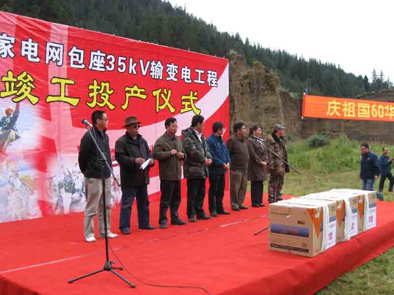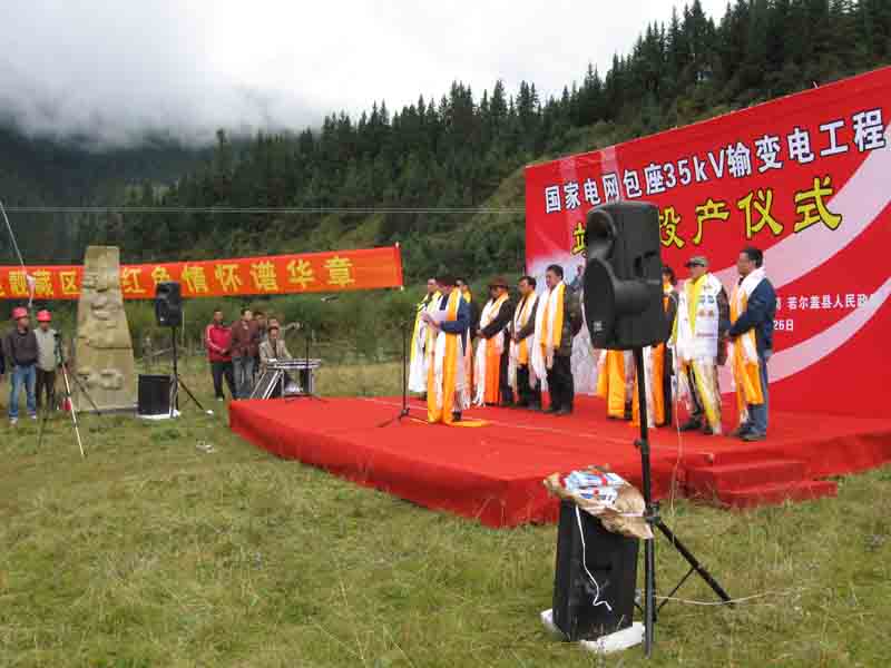 本工程于2009年9月26日順利通電,上級(jí)部門接到這一喜訊后,由四川電力阿壩公司、若爾蓋縣電力公司、若爾蓋政府、若爾蓋林業(yè)局、阿壩州新聞媒體等有關(guān)部門組織了通電剪彩儀式。并給予我施工隊(duì)肯定的表彰。當(dāng)?shù)卮緲愫┖竦哪撩褫d歌載舞給我施工隊(duì)獻(xiàn)上了潔白的哈達(dá)和光榮的錦旗。